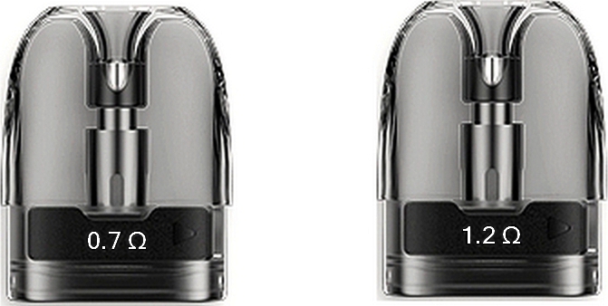 V balení se nachází 2 kusy POD cartridge s různou hodnotou odporu. První je POD se žhavící hlavou o odporu 0,7Ω pro MTL je vhodný pro volnější potahování. Druhý POD s odporem 1.2Ω tvoří méně páry a má utaženější potah.
