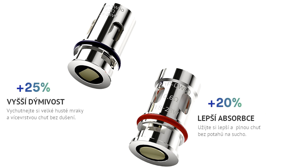 V základním balení potom najdete DL tělísko PnP-TW30 s odporem 0,3 ohm pro vzdušnější přímé potahování a nové MTL tělísko PnP-DW60 s odporem 0,6 ohm pro klasické šlukování.