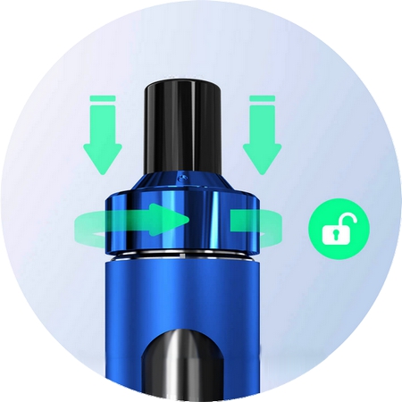 Vrchní uzávěr je opatřen speciální dětskou pojistkou, která zabrání nechtěnému otevření systému pro plnění v případě umístění v cestovním zavazadle, nebo nechtěnému otevření tanku dětmi. Pro zpřístupnění plnícího otvoru je nutné stlačit uzávěr dolů a následně jím otočit, díky této pojistce budete mít váš tank neustále v bezpečí proti případnému úniku e-liquidu.
