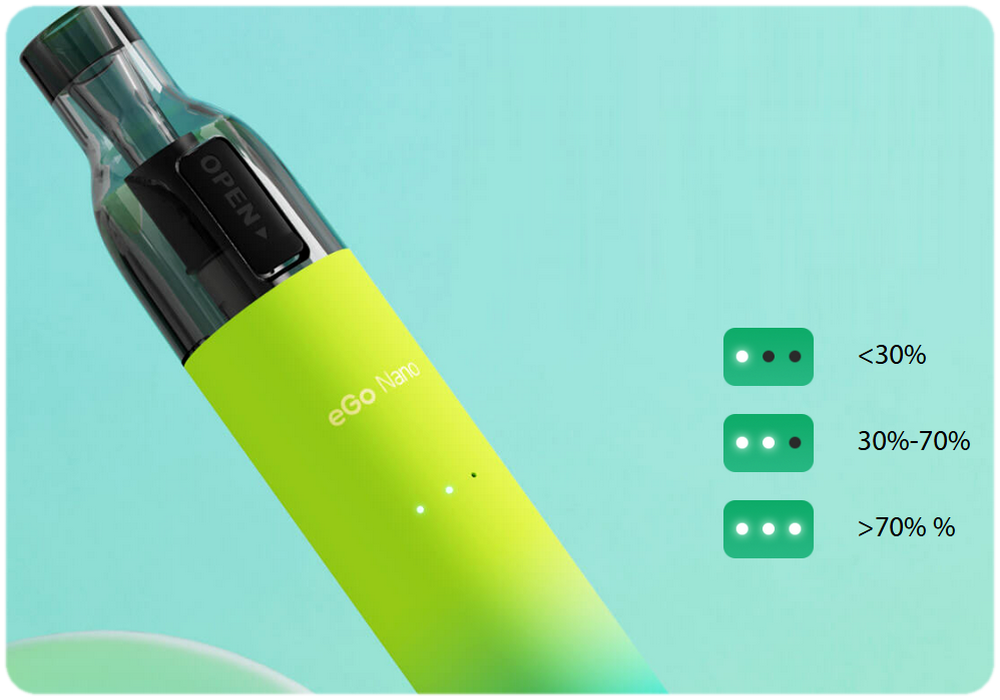 Přehledná LED indikace - Boční část těla zdobí tři praktické LED indikační diody. Ty slouží pro správné zobrazení aktuálního stavu baterie během používání. Podle počtu rozsvícených diod tak vždy poznáte, na kolik procent je vaše e-cigareta aktuálně nabitá a neunikne vám tak žádná informace.